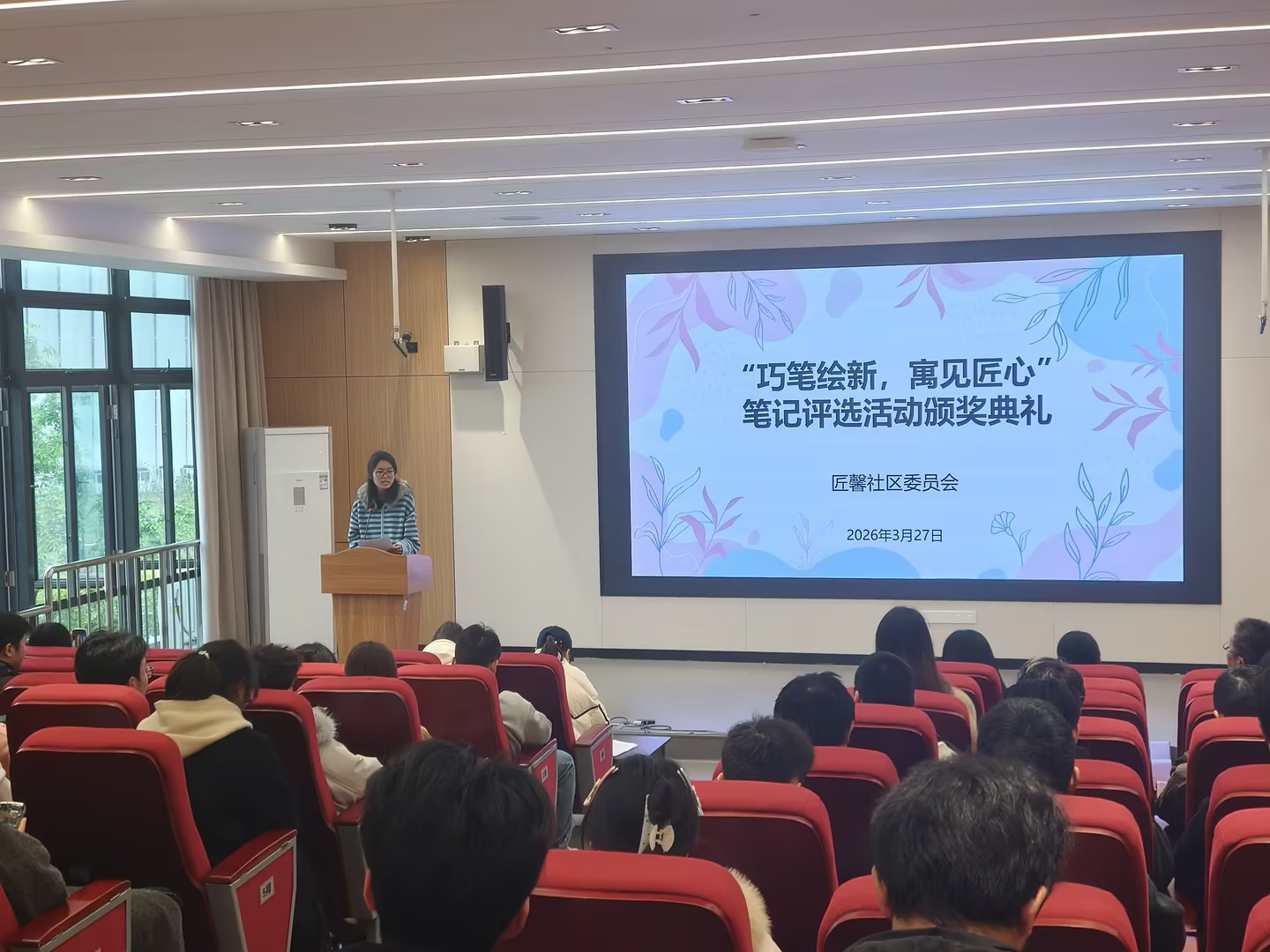 2026年3月27日,匠馨社区在卓智楼329报告厅隆重举行“巧笔绘新,寓见匠心”笔记评选活动颁奖典礼。各工科学院党委副书记、学生社区委员会主任、辅导员应邀出席,为获奖同学颁发荣誉证书。现场气氛热烈,获奖学生代表分享了笔记整理的思路与方法,展现了勤勉踏实的学习态度和精益求精的匠心精神。