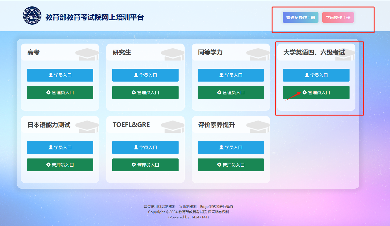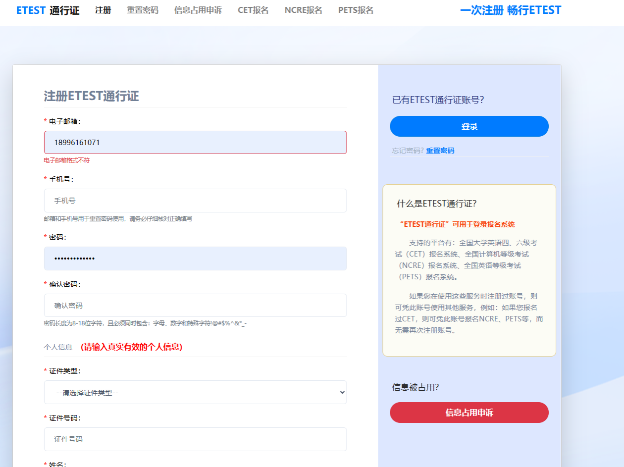 1、根据重庆市考试院《关于开展2024年下半年全国大学英语四、六级考试考务人员网上培训工作的通知》(渝教考函〔2024〕239号)通知要求,凡参加2024年12月14日全国大学英语等级考试(CET4\6)的考务工作人员和监考教师必须参加网上培训,培训时间为即日起至12月13日16时,培训网址是:https://kwstudy.neea.edu.cn/,在进行培训前,所有参与培训的人员必须先进入:https://passport.neea.edu.cn/填报本人相关信息完成注册,获得ETEST通行证。相关流程如下: