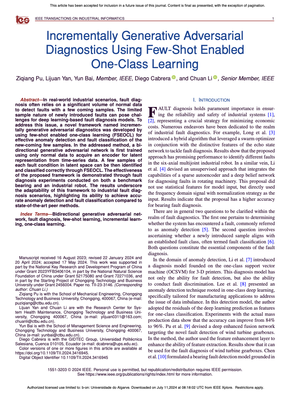 近期,太阳集团tcy8722青年教师蒲自强博士在国际工业信息领域顶级期刊IEEE Transactions on Industrial Informatics上发表了题为“Incrementally Generative adversarial diagnostic using few-shot enabled one-class learning”(使用少量样本赋能的单类学习进行增量式生成对抗性诊断)的学术论文(10.1109/TII.2024.3416945),在工业机械智能故障诊断领域取得了突破性进展。