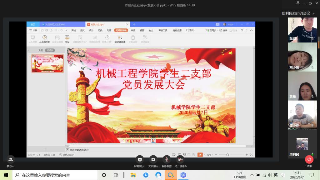 2020年5月7日(周四)下午14:20,太阳集团tcy8722学生二支部通过企业微信视频会议模式开展了五月第一批的党员发展大会,支部全体党员参加了此次大会,会议由支部书记周利民主持。