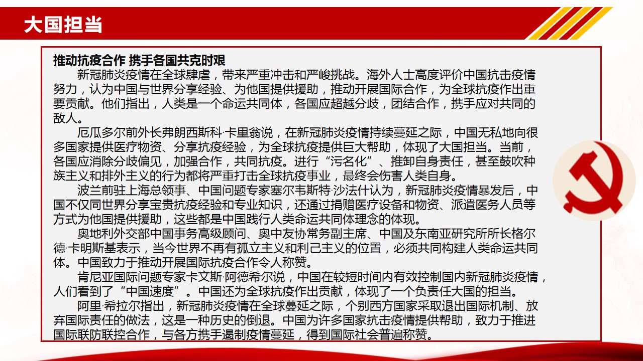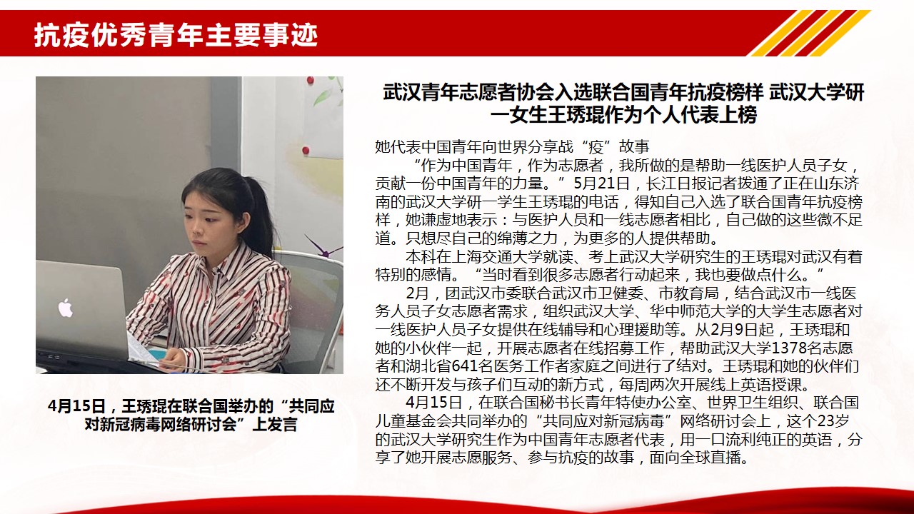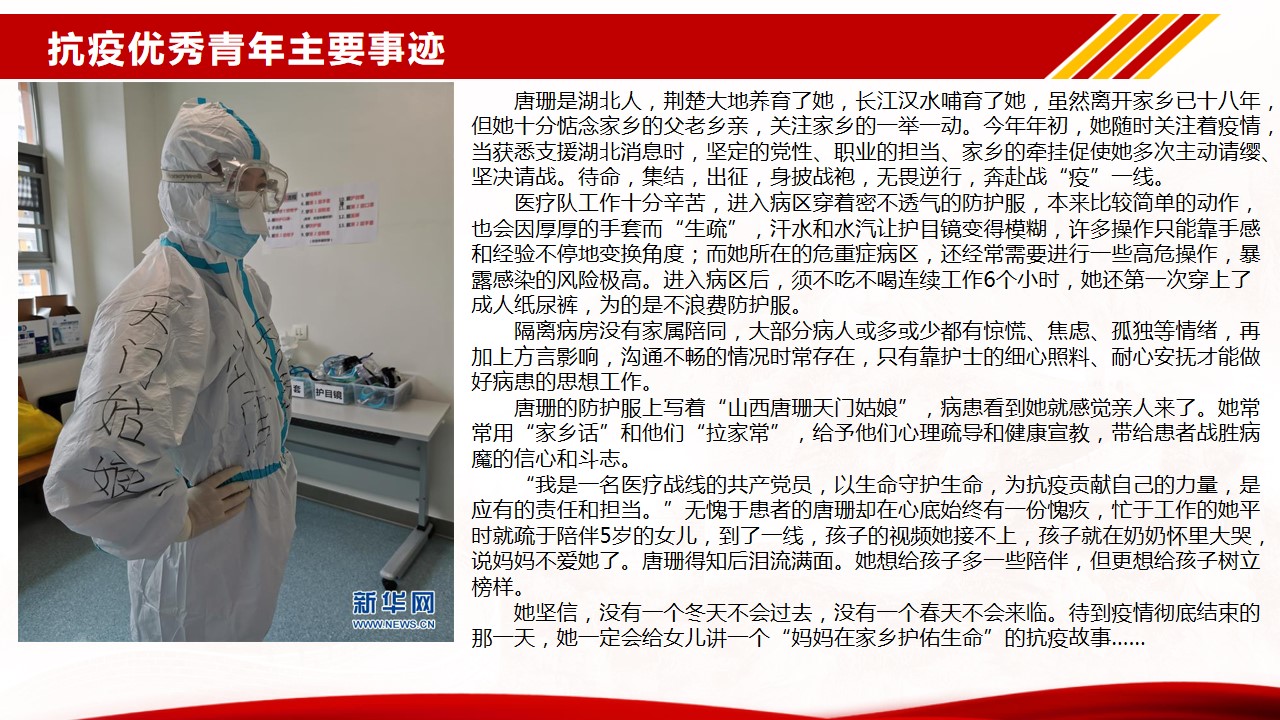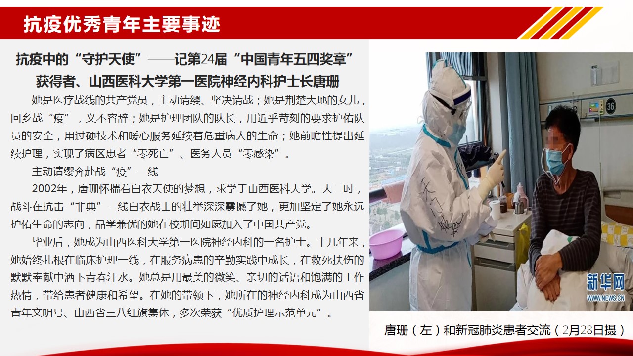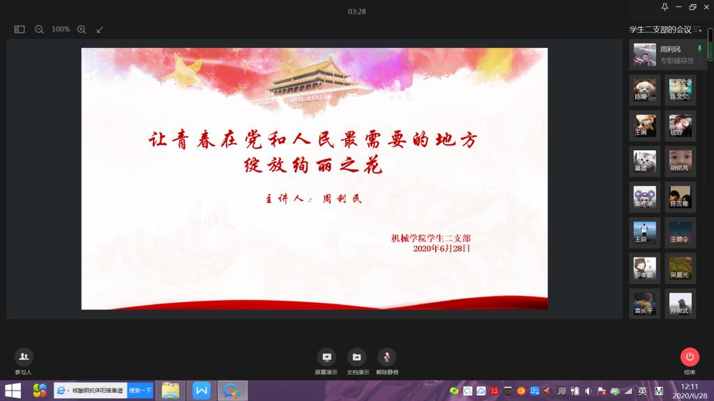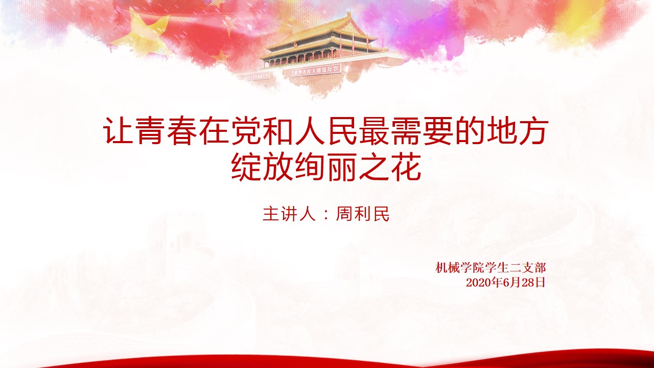 根据我校开展基层党组织常态化疫情防控“四个一”行动和“党课开讲啦”的通知,结合太阳集团tcy8722党总支的部署和要求,太阳集团tcy8722学生二支部于6月28日通过企业微信在线方式开展了主题党课“让青春在党和人民最需要的地方绽放绚丽之花”。本次党课由支部书记周利民老师主讲,党课以疫情期间冲锋在前的几个典型的优秀青年鲜活的事例为序,带领支部党员再次把目光聚焦在疫情期间的志愿者身上,学习他们勇于担当、践行初心使命的精神。随后,结合《抗击新冠肺炎疫情的中国行动》白皮书,用一组组扎实的数据,带大家一起回顾了新冠肺炎疫情防控取得的显著成效。通过此次学习和总结,支部党员再次感受到了“中国力量”、“中国精神”、“中国社会主义制度的优越性”。抗击新冠肺炎疫情是一场大考,中国展现的出色的疫情防控能力,也为世界防疫树立了典范。