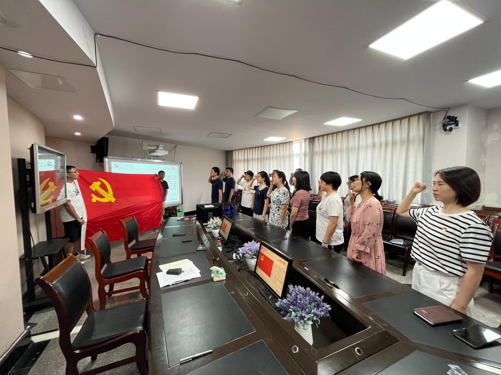 在学院会议室,本年度新发展的教工党员吴振宏在党旗下庄严宣誓,支部其他党员一起重温了入党誓词;支部书记马毓带领支部全体成员集体学习了重庆市第六次党代会报告决议内容、师德师风专题教育材料。