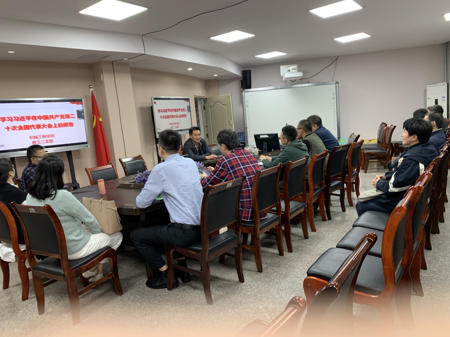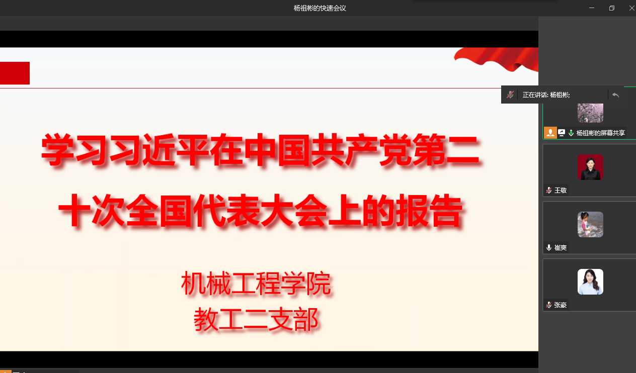 2022年11月4日,太阳集团tcy8722教工第二党支部在慧智楼90708会议室召开了支部会议,专题学习党的二十大报告。本次会议采用线上线下相结合的方式,会议现场由支部党员、学院副院长杨祖彬同志主持,支部全体党员参加学习。