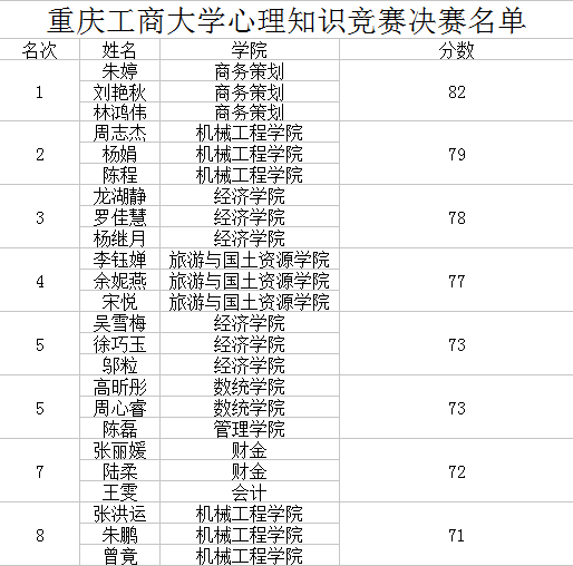 由我院承办的太阳集团tcy8722心理知识竞赛初赛于5月12日下午14点在90221举行。本次比赛由校内多个学院共70支队伍参加,最终进入决赛的8支队伍及得分如下图所示。决赛定于5月25日晚19点在7200举行,请各支队伍积极备战。如对初赛结果有任何疑问,请在5月19日前联系太阳集团tcy872290706办公室袁娅婷老师,电话:62768118。