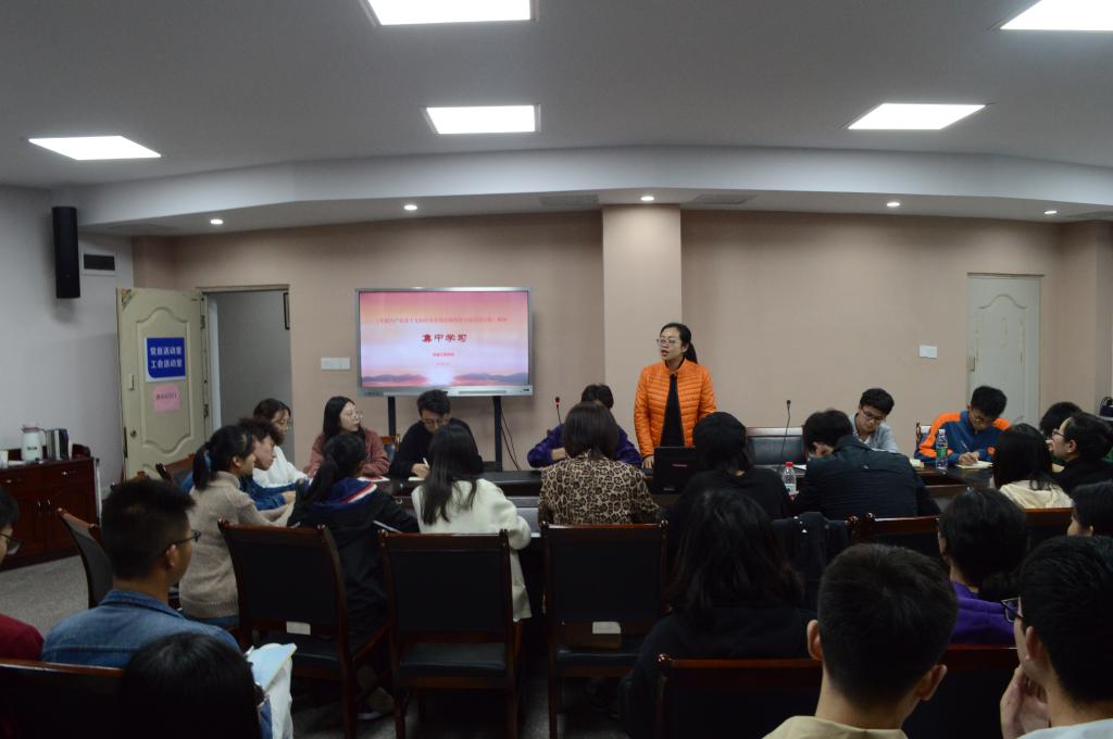 2019年11月1日19:00,太阳集团tcy8722学生在慧智楼90709集中学习《中国共产党第十九届中央委员会第四次全体会议公报》。学院学工办主任刘静老师主持了此次集中学习,我院分团委学生会、科技协会、初阳义工协会全体学生干部和学院学生第一党支部、学生第二党支部全体入党积极分子和预备党员参加了本次集中学习。