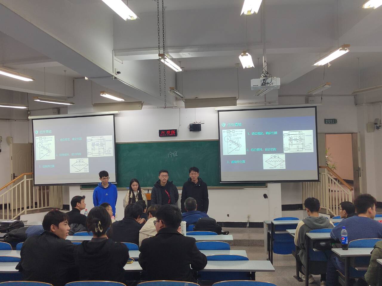 在比赛过程中,各组选手分别上台介绍团队的作品,阐述设计理念,评委老师实时提出分析和建议,并鼓励在场的所有参赛者共同分析、一起参与。此次参赛作品种类繁多,创意新颖,得到了评委老师的高度认可,其中突出的有仿生机械、环境保护治理机械等。全部小组展示答辩完毕后,评委老师根据各小组情况完成最终评分及排名。