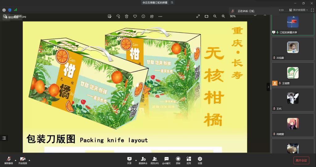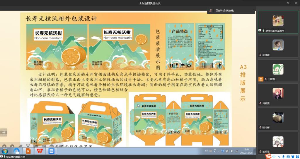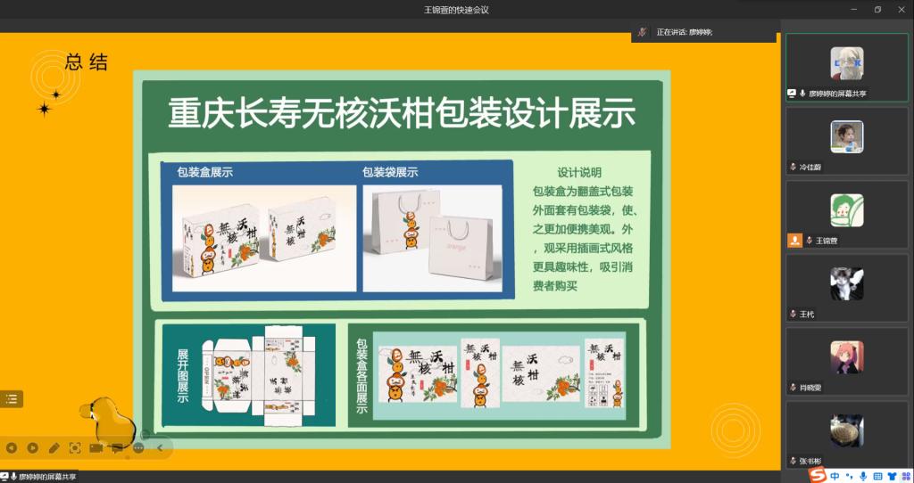 此次包装创意设计大赛的主题为“重庆长寿无核沃柑创意包装设计”。比赛由每组指定一位同学为代表对各自小组的作品进行介绍,首先由各组代表分别对作品进行介绍,阐述小组的设计理念,再由评委老师对每个小组的作品一一提问,对同学们的作品进行了建设性的点评并提出可改进的地方。同学们的设计突出艺术的创新,兼具地域文化底蕴,充分考虑实用性、成本优化,注重消费体验。其中很多作品都得到了评委老师的高度表扬。