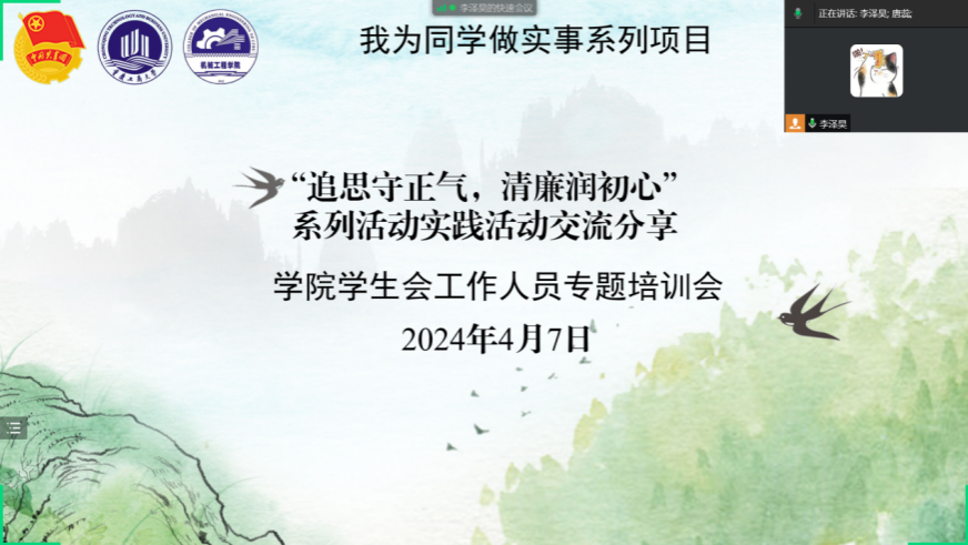 为进一步加强学生会组织规范化建设,提升学生会工作人员的工作技能和服务意识,4月7日晚,太阳集团tcy8722分团委学生会在线上召开2024年度春季工作人员培训会。会议由组织部负责人朱鹏举主持,分团委学生会全体成员参加会议。