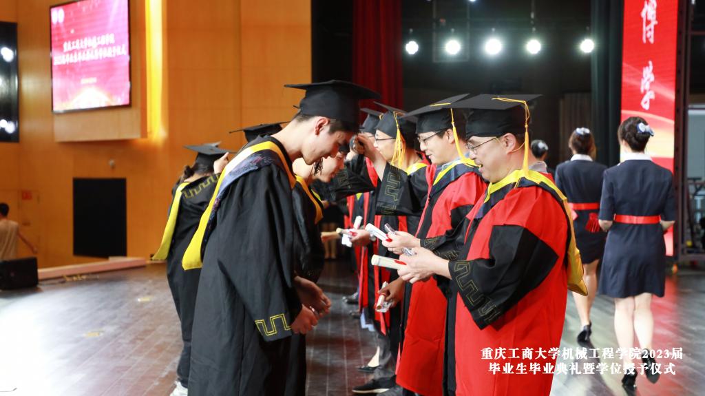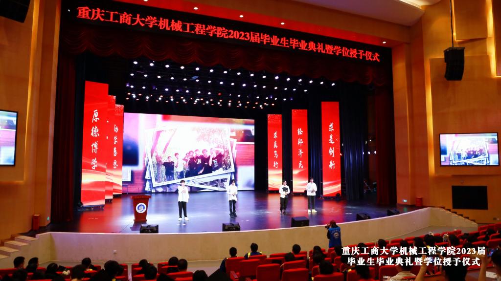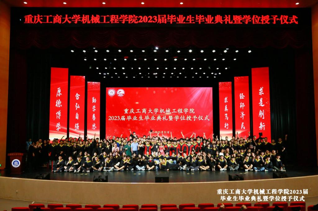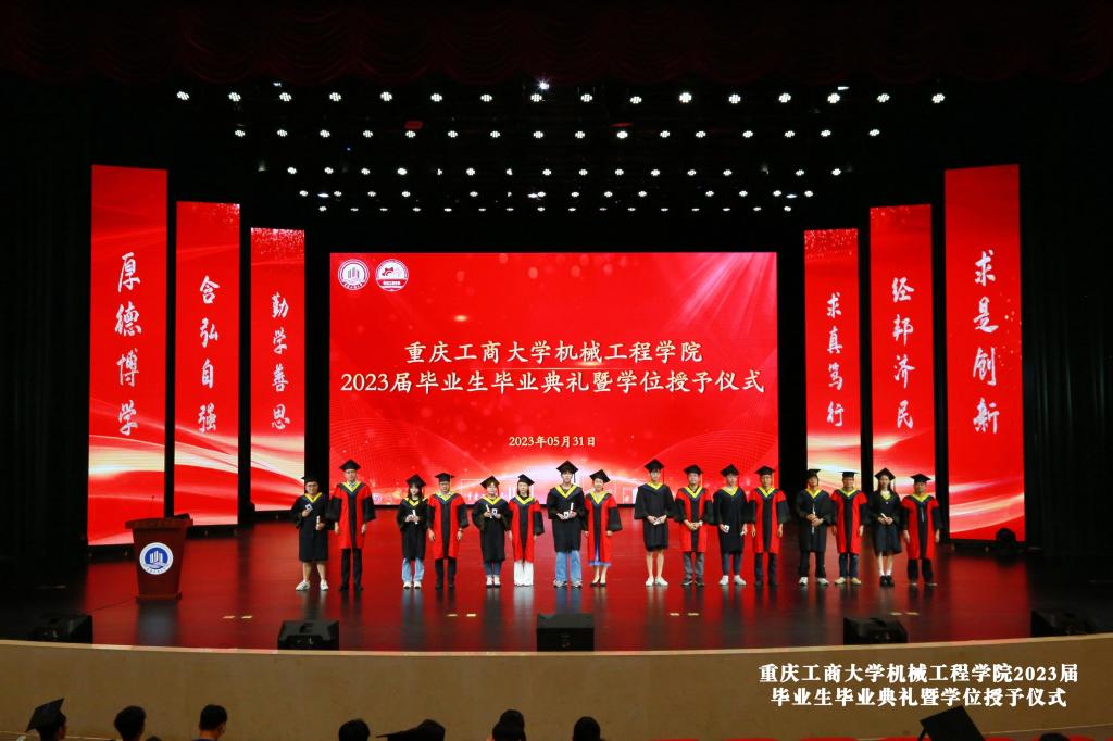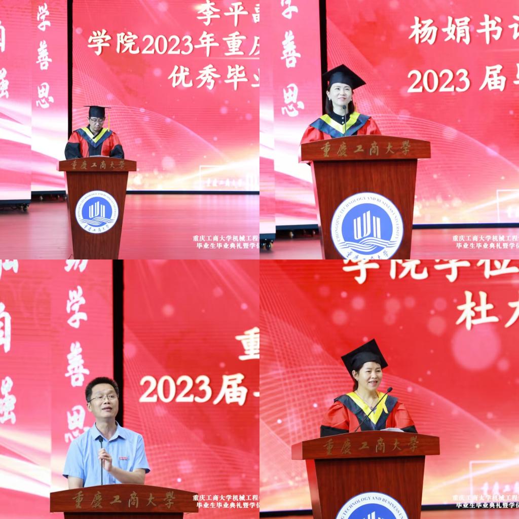 仪式在庄严的国歌声中开始,学院李平副院长宣读了2023年重庆市优秀毕业生表彰决定、太阳集团tcy8722优秀毕业生表彰决定文件和获奖名单。辅导员老师刘静、邢月军、饶俊妮、刘玺、梁正伟为余江南、谢德清、严喆、黄晓琴、程渝淑、陈泓西、张慧琳、黄颖、张俊杰、旷运川等11名优秀毕业生代表颁发了获奖证书,他们或在学习实践中成绩突出,或在学科竞赛中成果丰硕,或在志愿服务中表现优异,彰显了我们机械学子德才兼备、积极向上的精神风貌。
