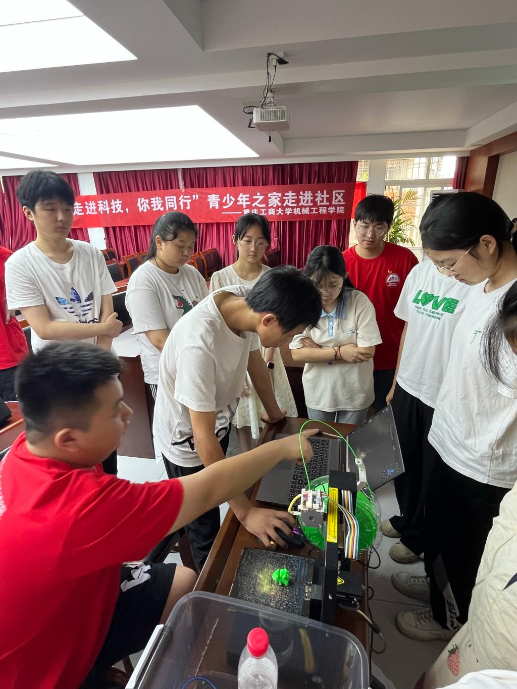 宣讲团成员黄丰以“什么是3D打印”为开场白,用趣味提问的方式引导青少年进行思考,引领青少年走入3D打印的奇妙课堂。黄丰为到场的青少年朋友们细致讲解了增材制造的基本原理,用“图片+实物”的形式展示3D打印成果,进一步激发青少年学习兴趣。随后,宣讲团成员结合UP Plus2打印机,为青少年们现场演示了3D打印机的使用方法,同时对使用过程中各个参数可能引起的产品性能变化及机器各个工作部位的作用等内容展开简要介绍。为了帮助青少年们更好感受先进制造技术的神奇,宣讲团成员帮助青少年们现场亲自操作3D打印机,进一步激发青少年们的好奇心和想象力,在他们心中植下科技的种子。
