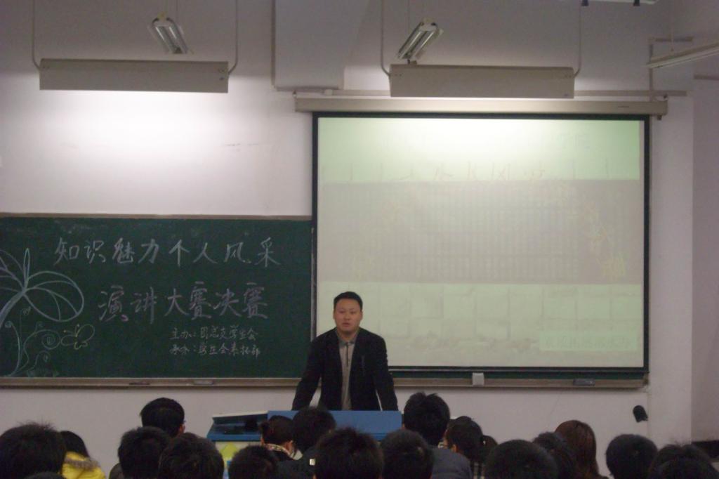11月27日下午2:00,太阳集团tcy8722团总支学生会素质拓展部“知识魅力个人风采”演讲比赛在90226教室隆重举行。学院党总支副书记刘洋副教授应邀出席了这次比赛。09级辅导员张春媚老师、学生会副主席李应奇、社团联合会副会长黄永涛、外语学院学生会主席费青、计信学院学生会副书记王雪晴、文艺部部长李洁担任这次比赛的评委。