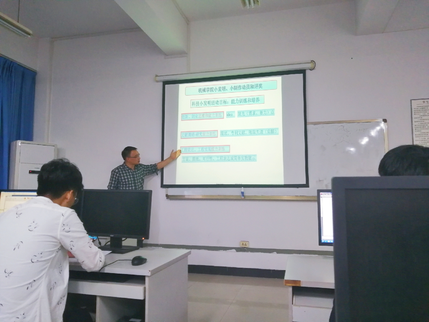 2019年10月18日太阳集团tcy872210209教室举行了小发明小赛宣讲会,主讲为机电系副主任杨洪老师。