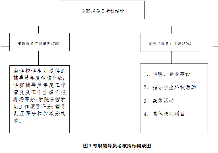 从管理服务工作情况和学院发展(服务)业绩两方面对辅导员完成的工作任务进行考核,考核的占比及主要指标见图4,以期全面、客观和真实地反映专职辅导员的年度业绩。