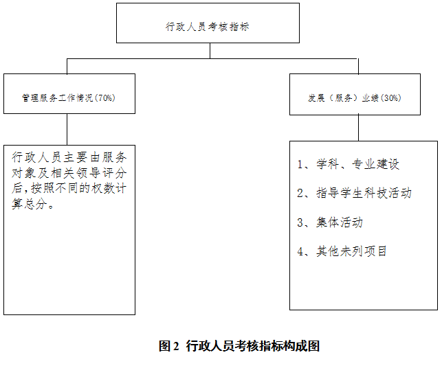 从管理服务工作情况和学院发展(服务)业绩两方面对行政人员完成的工作任务进行考核,考核的占比及主要指标见图2,以期全面、客观和真实地反映行政人员的年度业绩。