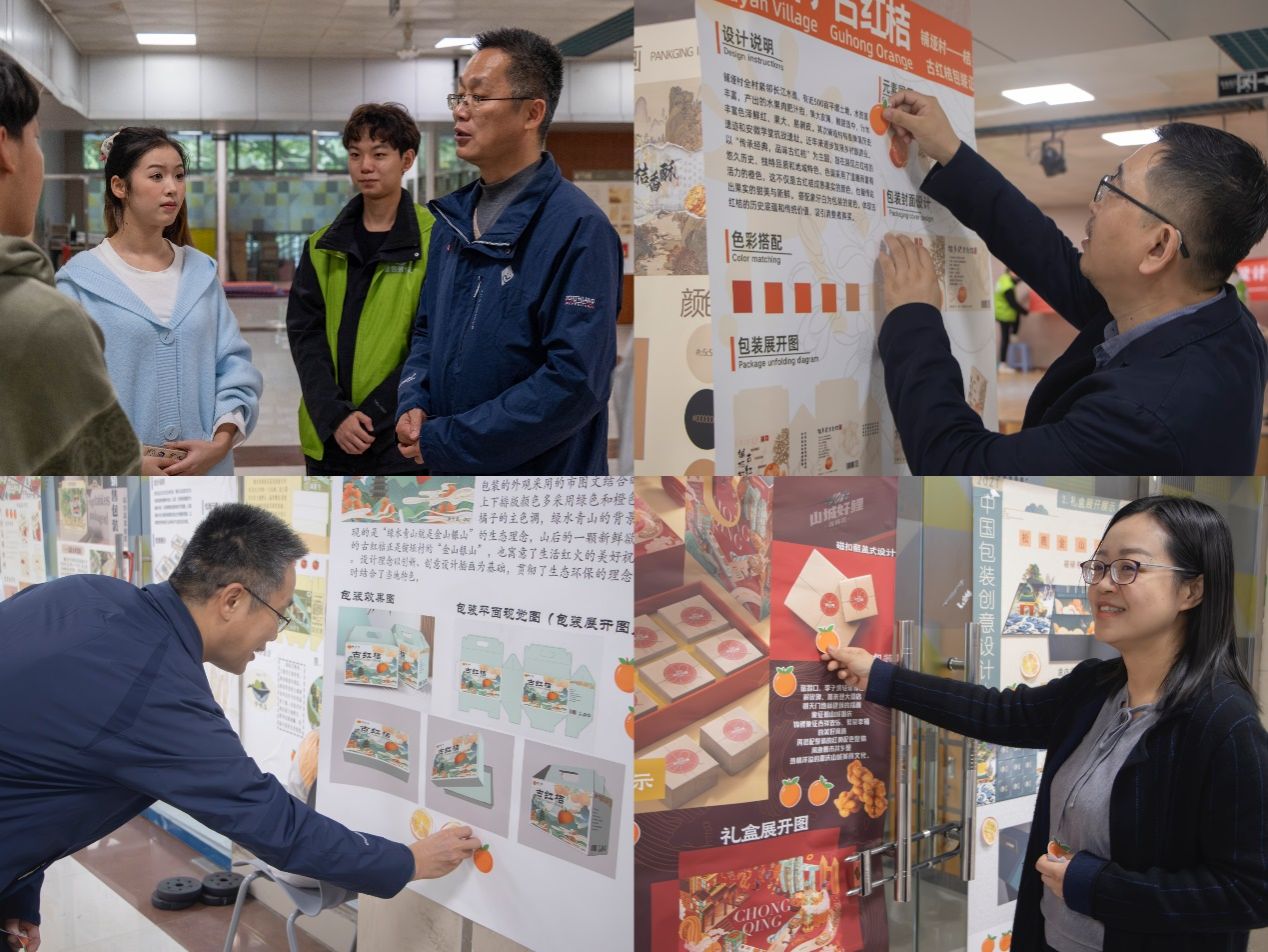 李平、陈春洁、刘静与星包装成员们共同参与了评选环节,为他们心仪的包装设计作品投票。各具特色的设计作品,不仅展示了学生们的创意才华,也展现了包装工程专业服务乡村振兴的实践成果。