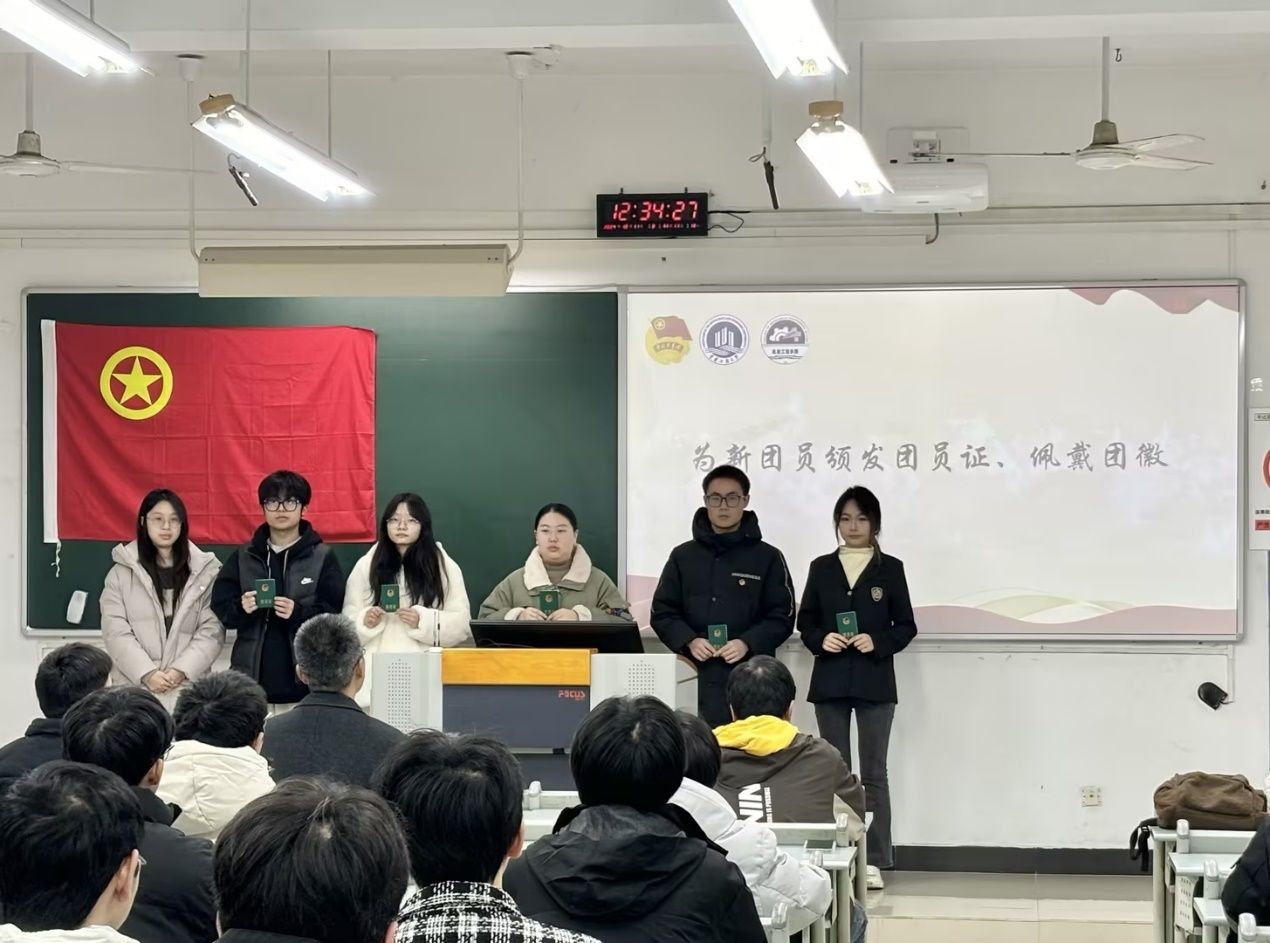 全体肃立,唱响国歌。团员代表莫小同学为新团员代表颁发团员证并佩戴团徽。团徽和团员证,不仅是共青团员身份的象征,更承载了一名共青团员所担负的使命和责任。