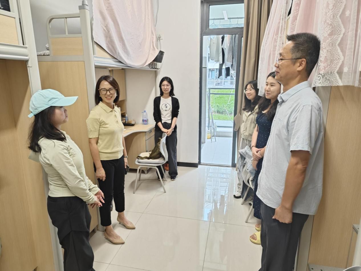 在学生公寓,学院党委书记杨娟、副书记陈春洁与学生交谈,了解学生假期去向。实地检查寝室用电安全,提醒学生增强安全防范意识,离宿时务必关好门窗、切断非必要电源。