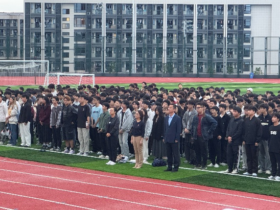伴随着雄壮国歌,五星红旗冉冉升起,全体师生肃立行注目礼,向国旗致以崇高敬意。