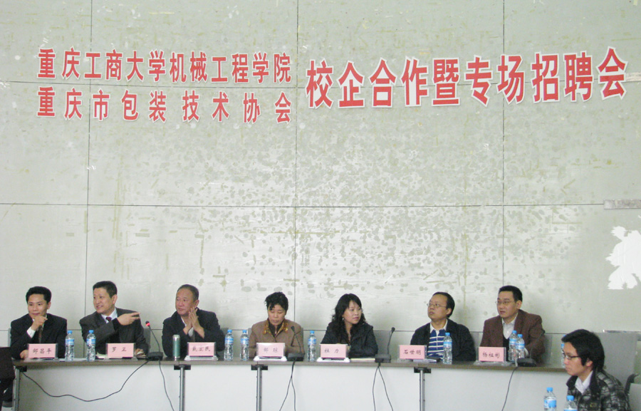 4月19日上午,机械学院联合重庆包装技术协会(下称重庆包协)在启智楼多功能厅举办了校企合作暨包装行业专场招聘会。中国包装联合会科学技术委员会主任、中国包装教育委员会副主任戴宏民教授、重庆包协秘书长邹琼、太阳集团处石世明处长、机械学院罗卫书记、杜力院长、杨祖彬、邹昌平副院长等领导出席了本次专场招聘会。