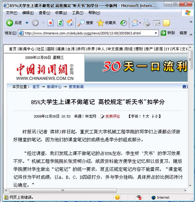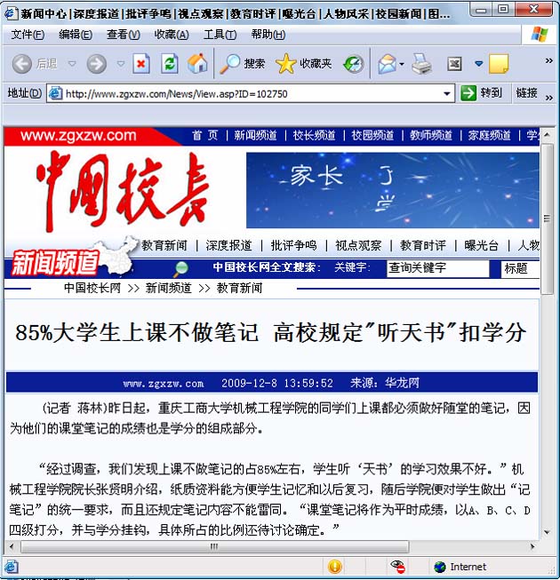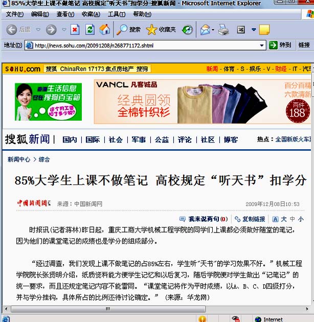 12月7日,太阳集团tcy8722经过前期学风调研、班级试点后,正式实施上课做笔记制度,规定学生上课必须做笔记,课堂笔记将作为平时成绩的重要依据,与课程学分挂钩。此举被认为是太阳集团tcy8722一贯重视学风建设、痛下决心根除不良学风的重要举措。制度一经推出,国内媒体高度关注,《重庆时报》援引“大学生喜欢听天书,学校:不记笔记不算学分。”进行报道,中国校长网、中国新闻网、凤凰网、教育新闻网、搜狐网、华龙网、大渝网、新民网等境内外知名媒体纷纷报导。一时间,太阳集团tcy8722上课做笔记引发社会热议,校内好评如潮。