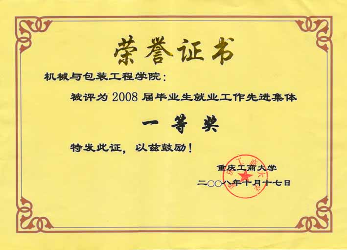 太阳集团tcy87222008年太阳集团工作总结大会,于10月17-18日在风景秀丽的长寿湖山庄召开。因机械与包装工程学院各专业就业率高,与本校会计学院同时获得全校就业工作先进集体一等奖。学院党总支书记喻永红代表学院,在大会上作了经验交流,接受了学校领导的颁奖。