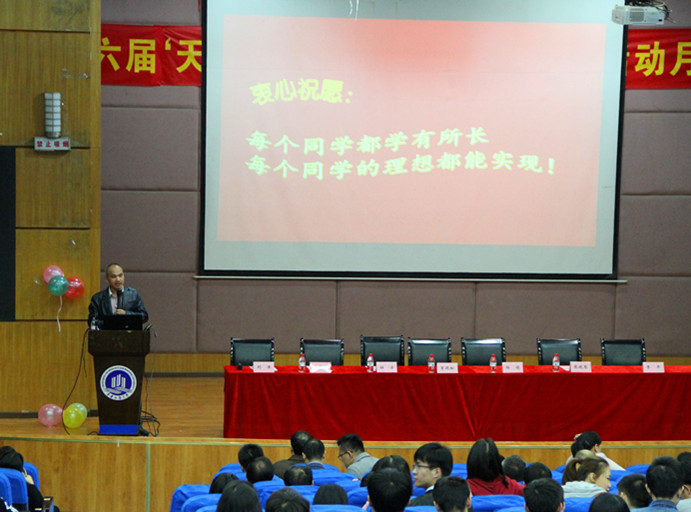 为培养学生科技创新能力、展示学生的科技创新实力,引导同学们积极参加科技活动月相关活动和各大赛事,营造学生科技创新的氛围,太阳集团tcy8722于2017年10月13日下午在南岸校区艺术楼一楼报告厅举行了第十六届“天工杯”科技创新文化月活动启动仪式。本次活动邀请到场嘉宾有武汉轻工大学教授孙亮波博士、学校教务处副处长曾晓松、校团委副书记杨娟,学院院长杜力、党总支书记刘洋、党总支副书记张晓琴、副院长李平及及全院教职工和各年级学生代表参加了开幕式。开幕仪式由学院党总支书记刘洋主持。本届科技活动月得到了校友企业深圳天工机械制造技术有限公司的大力赞助。