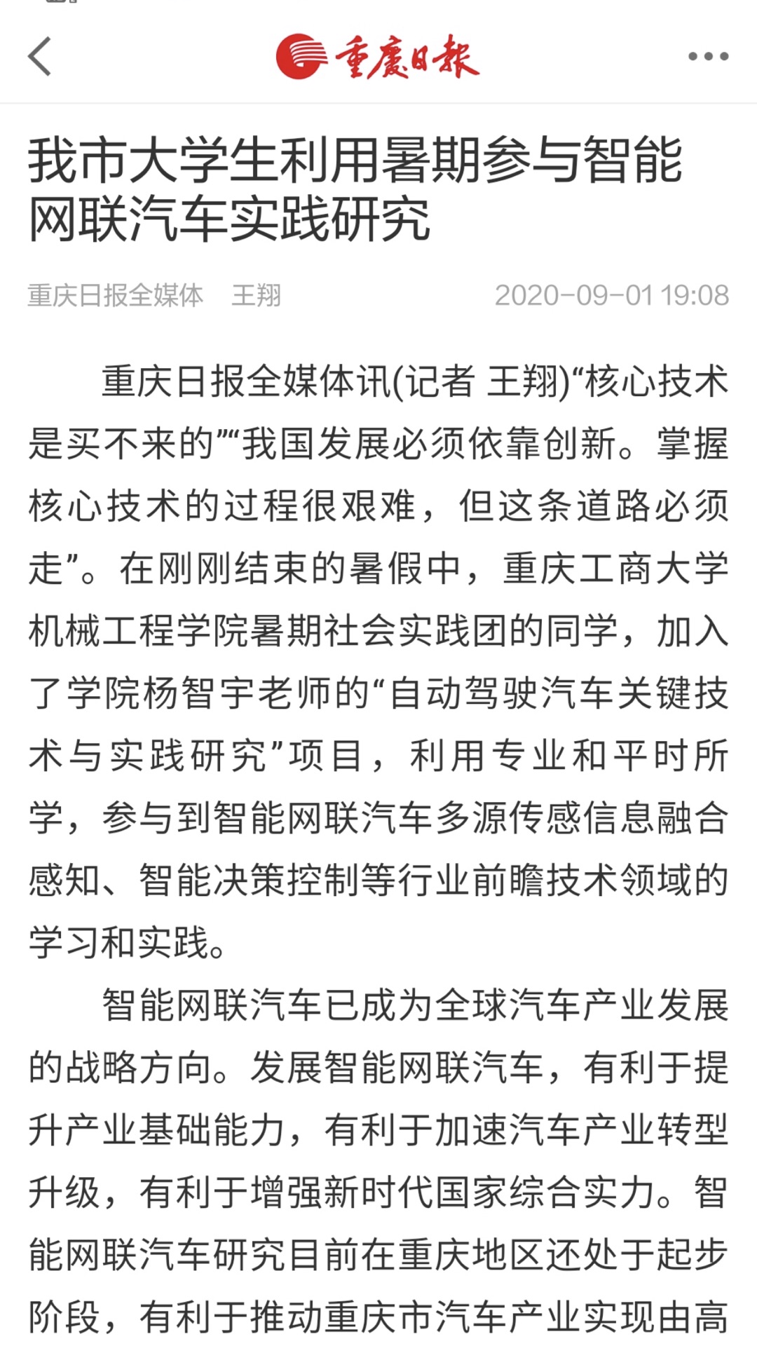 近日,《重庆日报》对太阳集团tcy8722学生参与我校教师杨智宇的“自动驾驶汽车关键技术与实践研究”项目,共同开展智能网联汽车多源传感信息融合感知、智能决策控制等行业前瞻技术领域的实践研究进行了专题报道。智能网联汽车现已成为全球汽车产业发展的战略方向,相关研究目前在重庆地区还处于起步阶段,该领域研究具有巨大的产业需求,有利于推动重庆市汽车产业实现由高速增长向高质量发展转变,巩固重庆市汽车产业在全国的领先地位,增强汽车产业对全市经济发展的支撑作用。