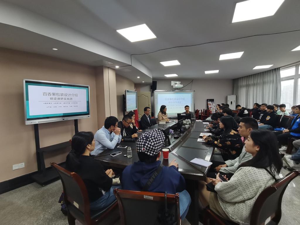 学院星包装协会会长严喆同学为大家具体介绍了此次铜梁民族团结实践团针对当地百香果包装升级的相关方案。他们从铜梁水口百香果的调研情况出发,就果实易腐败、贮存条件有限等问题设计出了十分具有特色的包装。并从结构,装潢以及保鲜等方面详细说明了相关原理与知识。此外,他还提出了现有设计的不足之处与后续推进安排,向现场的同学们征集了改进意见与建议。