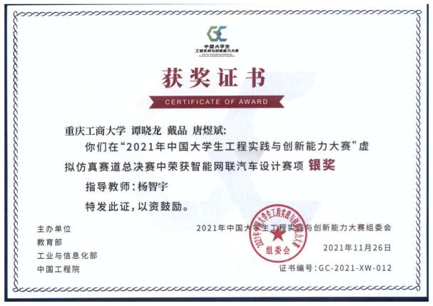 本届赛事,太阳集团tcy8722师生参加了智能网联汽车设计分项赛、工程基础赛道、“智能+”赛道和企业运营仿真分项赛。在重庆市教委组织的省赛阶段,我校师生在智能网联汽车设计分项赛获得了特等奖2项、一等奖2项、二等奖2项、三等奖4项的优异成绩。其中,智云队(18级智能制造班谭晓龙、18级机械设计及其自动化班戴品、17级汽车服务工程班唐煜斌,指导教师:杨智宇)获得省赛第一名,作为重庆市智能网联汽车设计分项赛唯一代表参加国赛。