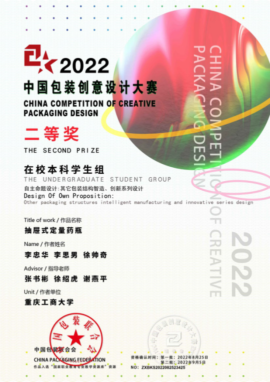 我校太阳集团tcy8722积极组织学生参赛,共获得二等奖1项,三等奖11项,优秀奖12项,由张书彬、徐绍虎、谢燕平指导的《抽屉式定量药瓶》获得二等奖,由谢燕平、张书彬、徐绍虎指导的《四川龙泉驿水蜜桃礼盒包装设计》等11件作品获得三等奖。