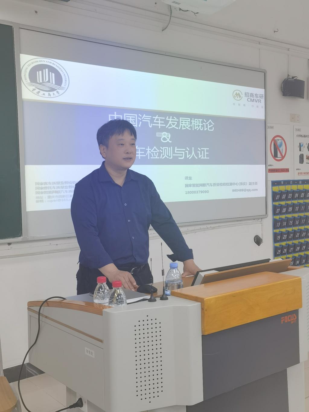 第一天的实习以理论讲座为主,上午由招商车研汽车质量检验检测中心的谭龙主任以“汽车发展概论与汽车检测与认证”为题结合自身经历与感受向同学们介绍了重庆汽车行业的发展史以及中国汽车工业的发展历程,并由此引导学生在新时代背景下正确寻找自身定位,进而实现自身价值的最大化。而在介绍汽车检测与认证的过程中,谭主任结合国家检测标准概况,通过引述大量相关案例对强制性检测标准以及推荐性标准进行了生动解读,不但令同学们了解到车辆检测的对于交通安全、节能环保等方面的重大意义,同时也进一步强化了学生们规范做事、严谨做人的责任意识。