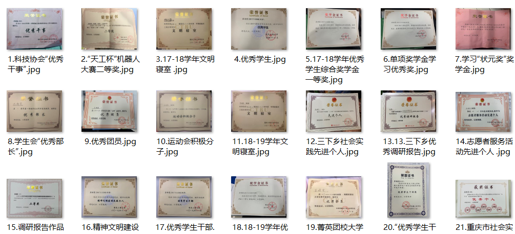 在校期间,被评为重庆市优秀学生干部、社会实践优秀个人;获得两次学生综合一等奖学金、单项奖学金学习优秀奖、学习状元奖学金、优秀学生干部奖学金;校级优秀团干部、优秀团员、优秀学生、优秀学生干部、菁英团校大学生骨干培训优秀学员、三下乡社会实践先进个人、精神文明建设先进个人、志愿者服务活动先进个人、学生会优秀部长、科技协会优秀干事、校运动会积极分子等称号;在校期间还积极参加各种校园活动,曾获得“天工杯”机器人大赛二等奖、“奋斗的青春最美丽”2019暑期“三下乡”社会实践调研报告作品大赛二等奖、三下乡优秀调研报告、职场精英挑战赛全能精英奖。