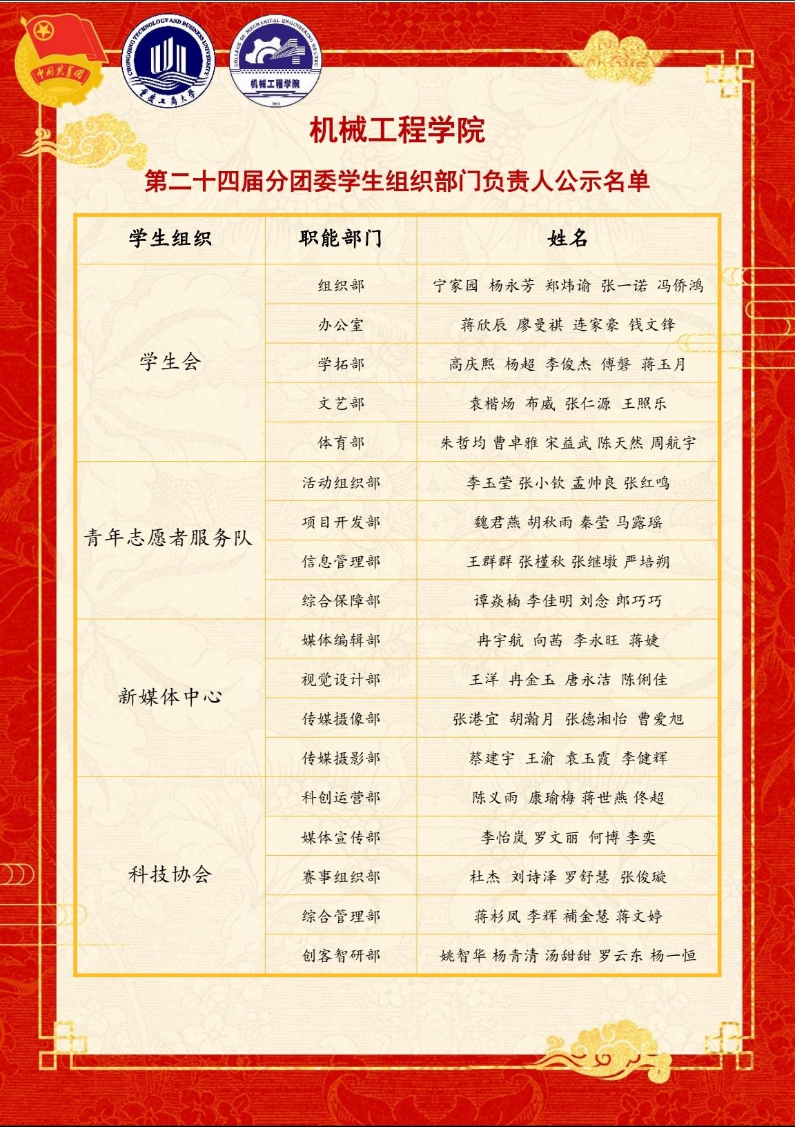 根据分团委《关于开展2025-2026学年太阳集团tcy8722分团委学生组织部门负责人换届选举的通知》的工作要求,经学生本人自荐、班级推荐、资格审查、学院党委、团委、学工领导小组两轮考察,现将第二十四届太阳集团tcy8722分团委、学生会、青年志愿者服务队、新媒体中心、科技协会部门负责人名单公示如下: