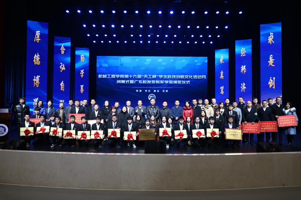 2016年,1990级机械制造工艺及设备专业校友钟仁东向母校捐赠人民币100万元,发起设立广东校友奖教奖学基金,用于激励学院学生提高专业素养,增强实践能力,树立典型榜样;激励老师致力前沿技术研究与攻关。五年来,共有35位老师,190人次学生获得此项奖金。本年度共评选出“学生状元”和“优秀学生干部”33人,“教学与突出贡献”教师7人。梁强和阮世会分别作为广东校友奖教奖学金获奖教师代表和学生代表发言。在校友榜样力量的影响下,阮世会同学发奋图强,三次获得广东校友奖学金,多次获得国赛奖项,并荣获2019年“中国大学生自强之星”奖学金。钟仁东校友在颁奖仪式上寄语青年学子:希望大家做到专一,集中精力完成值得付出的事情;希望大家能够坚持,学会在困难中保持前行;希望大家保有信心,未来十年大展宏图。